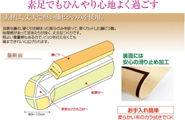 TOP寝具・インテリア 籐・ラタン製品 籐キッチンマット・廊下敷き 関連商品 籐キッチンマット 45×150 籐キッチンマット 45×180 籐廊下敷 80×420 籐 廊下敷 39穴 80×420cm 価格: ¥27,164 (税込) 販売期間: 数量: 個 在庫: 在庫切れ 在庫 在庫切れ 返品についての詳細はこちら ◎籐材は、丈夫で堅い籐ビラのみを使用。 ◎ 地厚感があって足あたりがよく、丈夫なつくりです お手入れが簡単で、素足でもひんやり心地よく快適です。 籐玄関マット(80×420cm) 材質 天然セガ籐100%、へり部:手かがり仕上げ、裏面:すべり止め加工 ●インドネシア製