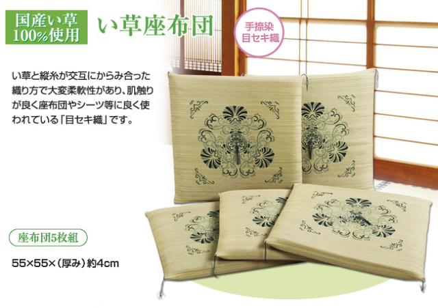 TOP寝具・インテリア い草・花ござ 涼しさを演出する。い草座布団「目セキ織・5枚組」 国産い草を使用し、しなやかで、へり無しで仕上げた上品な座布団です。 柄は、手捺染め仕上げ。京都の紋柄師、中村忠治郎が大正の始め備中倉敷に移住し友禅染の手法を使い 花むしろの捺染に成功した丸刷毛捺染の技法を用いた物です。 い草 座布団 目セキ織(橘 5枚組)55×55cm 価格: ¥18,700 (税込) 販売期間: 数量: 個 在庫: 在庫あり 在庫 在庫あり 返品についての詳細はこちら ■商品番号■60040 い草座布団・目セキ織(5枚組) サイズ 55×55×(厚)約4cm ●重さ:1枚/0.7kg 材質 国産い草100% ●中材:低反発ウレタンフォーム