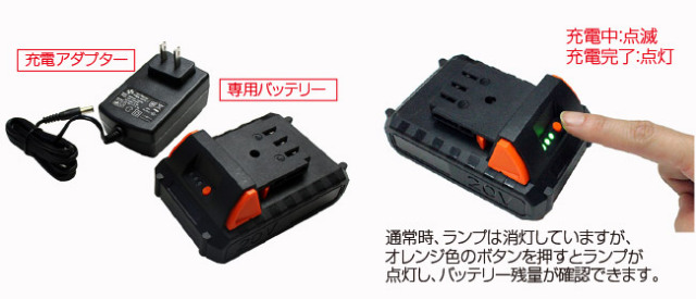 | 仕 様 | ■充電アダプター/電圧:100V ●周波数:50-60Hz ●充電時間目安:約1.5時間 ■電圧(バッテリー):18V(最大出力20V) ●容量(バッテリー)2000mA ●定格時間(無負荷時)最大約30分 ●ストローク長:13mm ●ストローク数:0〜2100回/分 |