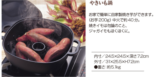 TOP生活雑貨・日用品 南部鉄器 南部鉄器 やきいも鍋 価格: ¥14,800 (税込) 販売期間: 数量: 個 在庫: 在庫あり 在庫 在庫あり 返品についての詳細はこちら ■商品番号■62178 南部鉄器・やきいも鍋 サイズ 外寸/幅310×奧行255×高さ(持ち手含む)205mm ●内寸/245×245×深さ72mm ●重さ:5.1kg 材 質 本体:鋳鉄(シリコン焼付塗装) 生産国 日本(岩手県盛岡市)