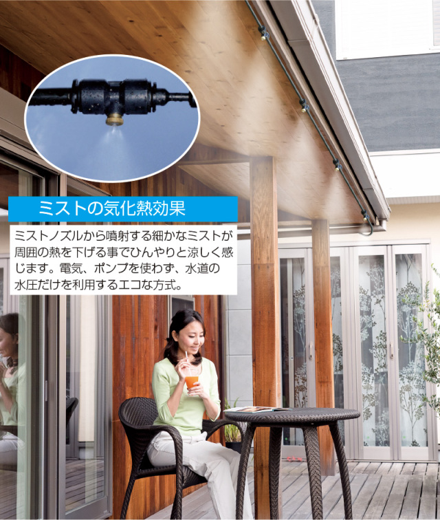 | セット内容 | 専用チューブ(15m)×1、ミストノズル×10、噴霧口×10、末端用キャップ×1、蛇口ニップル×1、蛇口用コネクター×1、チューブ固定具×15、タッピングビス×15、コンクリートプラグ×15、結束バンド×15、チューブカッター×1 |