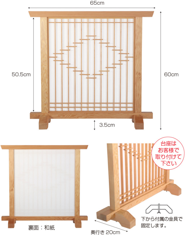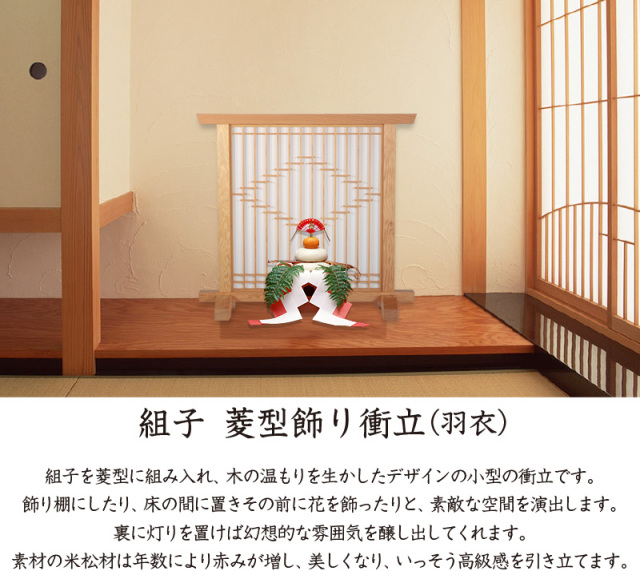 TOP寝具・インテリア 組子衝立 関連商品 菱型飾り衝立 白糸 菱型飾り衝立 羽衣 麻の葉組子衝立 組子衝立 極 具象組合せ組子衝立 無双衝立 組子 菱型飾り衝立(羽衣) 価格: ¥36,000 (税込) 販売期間: メーカー直送品のため代引きはご利用できません: 選択してください ご了承ください 沖縄、離島は別途送料がかかります: 選択してください ご了承下さい 数量: 個 在庫: 在庫あり 在庫 在庫あり 返品についての詳細はこちら ■商品番号■62778 組子 菱型飾り衝立(羽衣) サイズ (約)幅65×奧行20×高さ60cm ●重さ:約2.0kg 材質 米松材(ピーラ材)、和紙 仕 様 一部組立 付属品 取付金具 生産国 日本