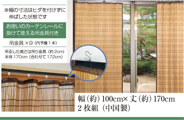TOP寝具・インテリア カーテン・スクリーン 防カビ加工 竹カーテン 竹すだれカーテン 価格: ¥9,000 (税込) 販売期間: 数量: 個 在庫: 在庫あり 在庫 在庫あり 返品についての詳細はこちら ■商品番号■62933 防カビ竹すだれカーテン(2枚組) サイズ (約)幅100×丈170cm(±2%) ●重さ:約1.75kg(1枚) 材質 本体:竹100% ●縁布:ポリエステル100% 付属品 吊り金具:18本:(内予備2本) 生産国 中国